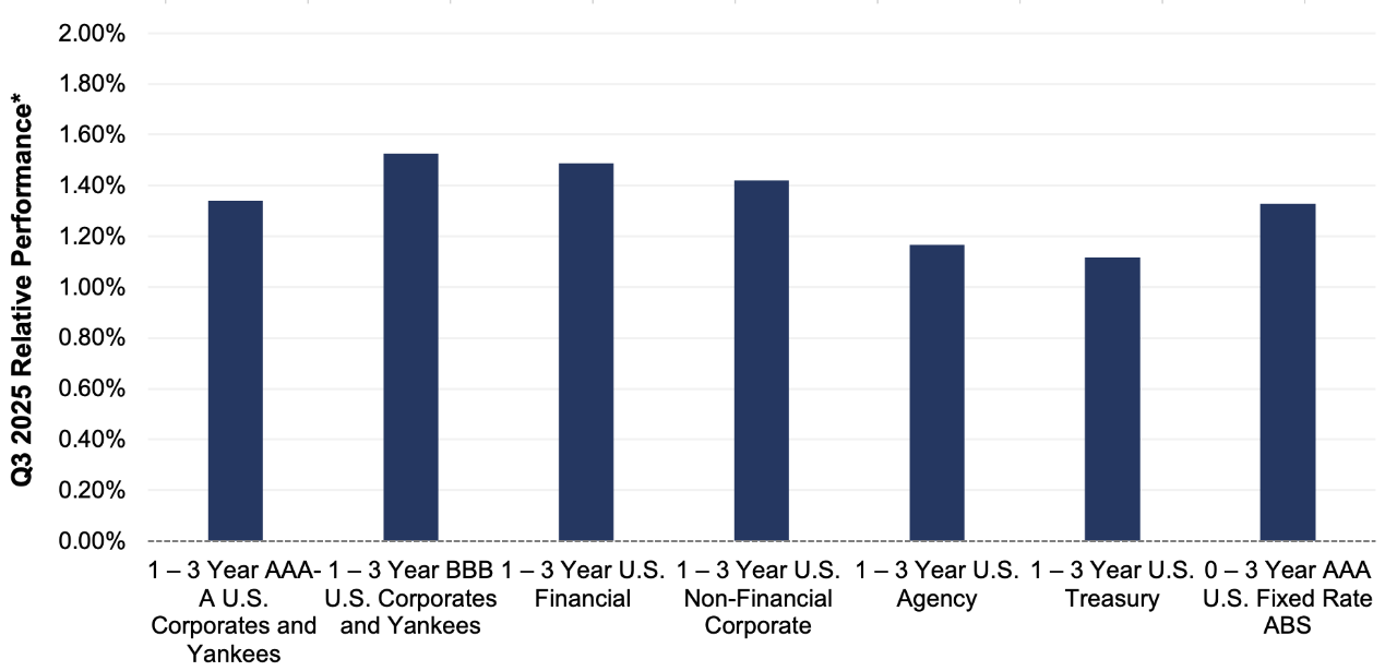Similar to the second quarter, lower Treasury yield curve levels and tighter credit spreads across the investment-grade universe generated strong absolute performance for all fixed income sectors. Down-in-credit outperforming higher-rated credit was a general theme, highlighted by the BBB corporate index’s 17.8 bps outperformance of the AAA-A corporate index.